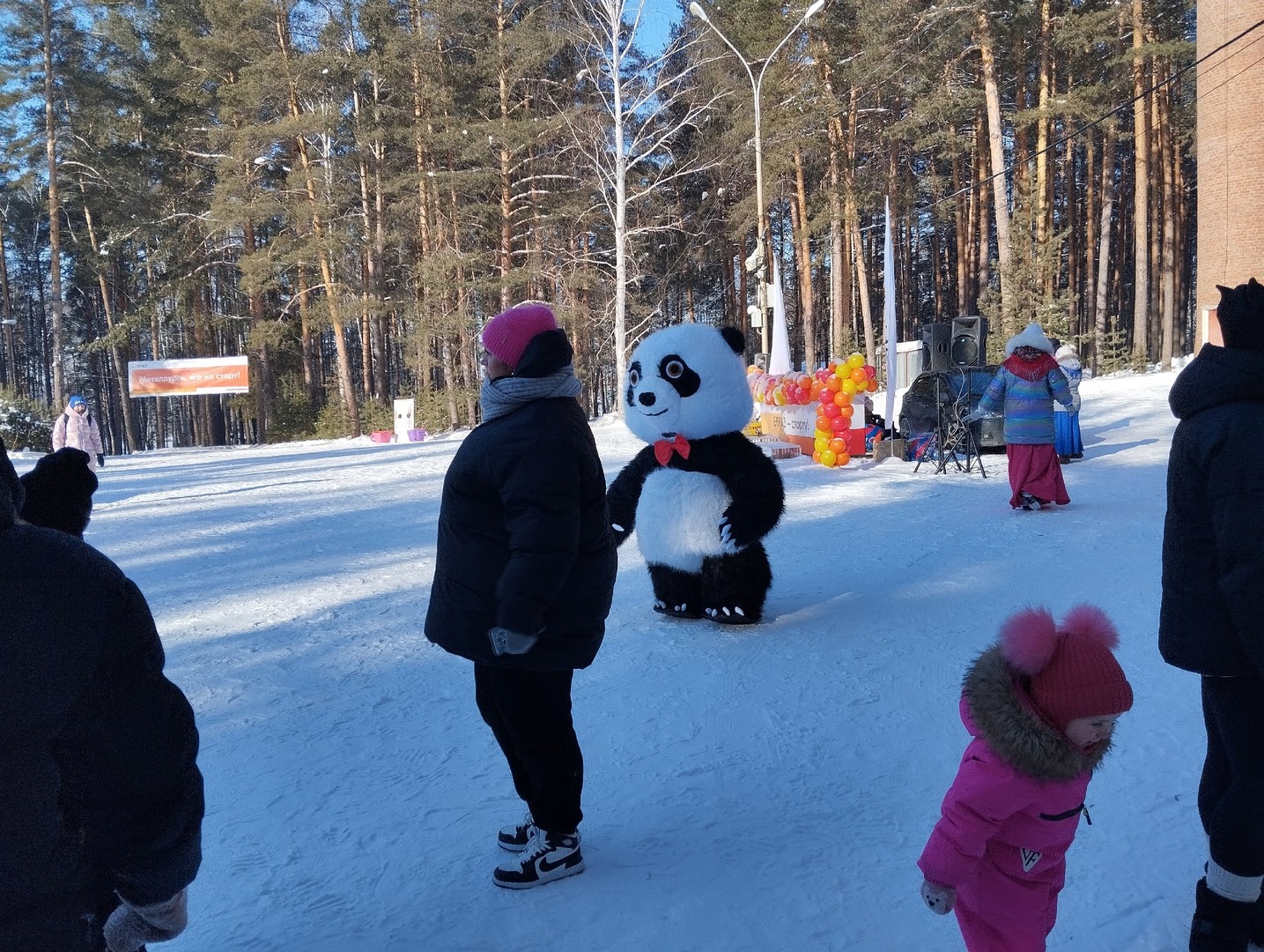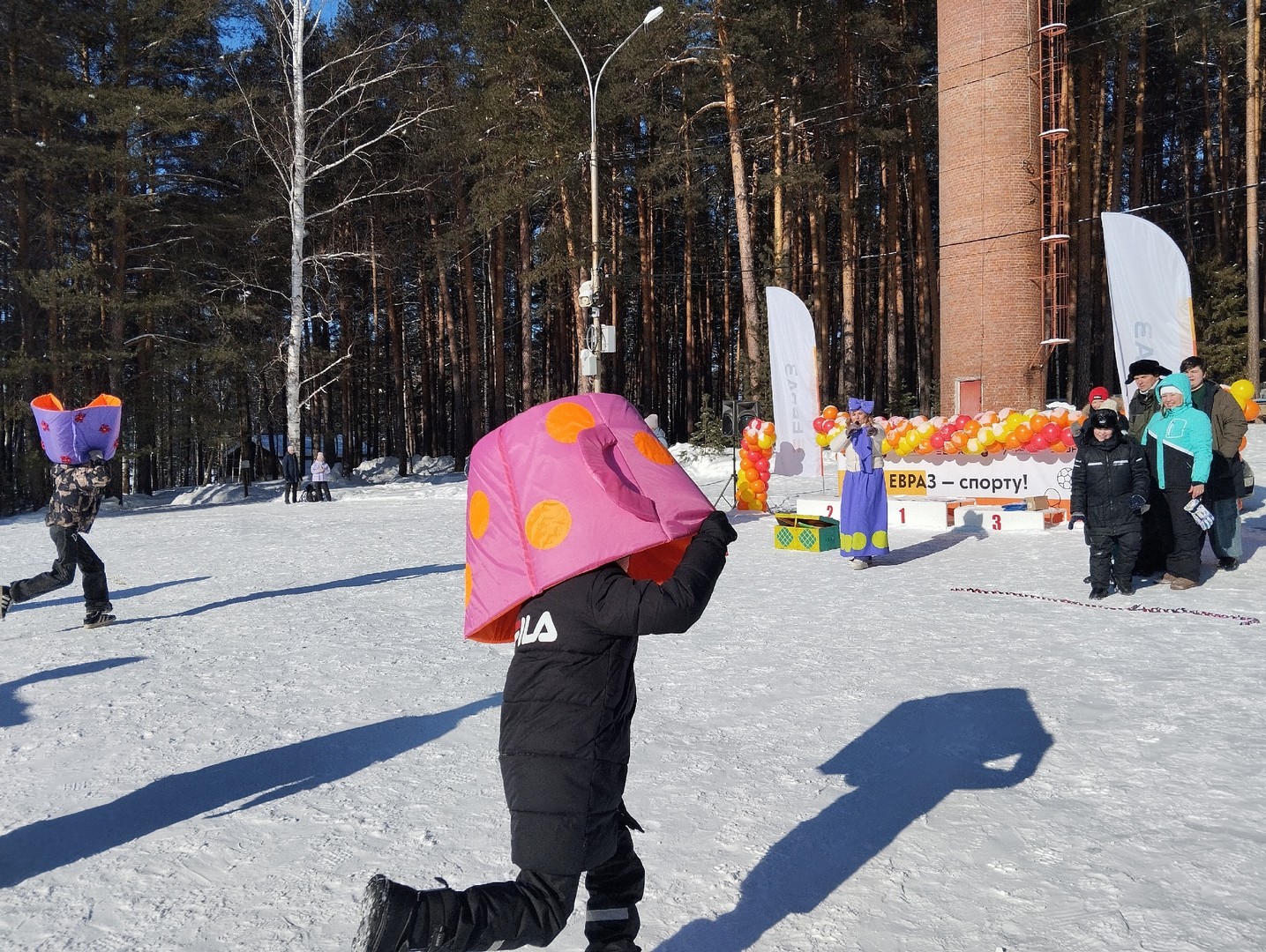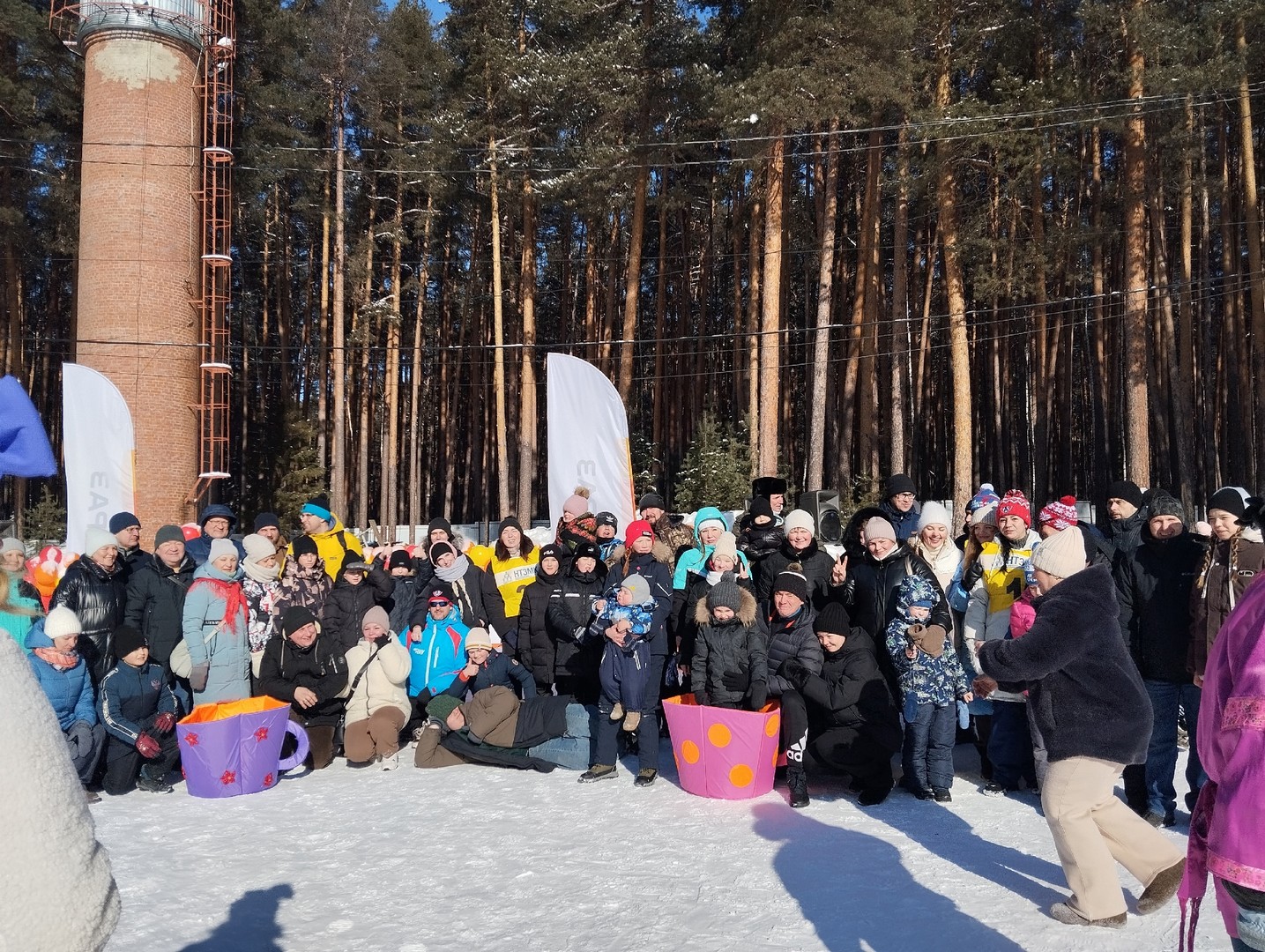 А пока спортсмены покоряли лыжню, на верхней поляне во всю веселились те, кто приехал с детьми. Аниматоры не давали скучать никому: народные забавы, весёлые конкурсы с призами, песни и танцы создавали позитивное праздничное настроение.
