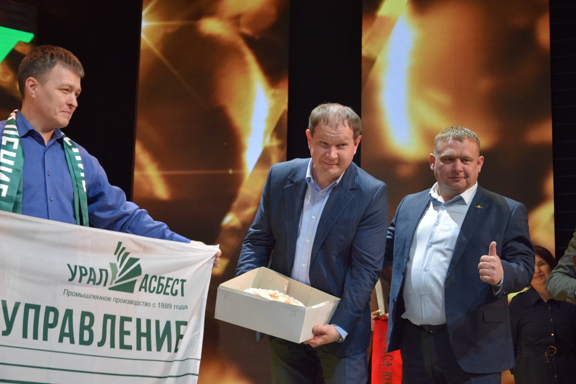 Самая активная группа поддержке признан коллектив рудоуправления, и председатель профсоюзной организации ПАО "Ураласбест" Леонид Ремезов вручил огромный торт.